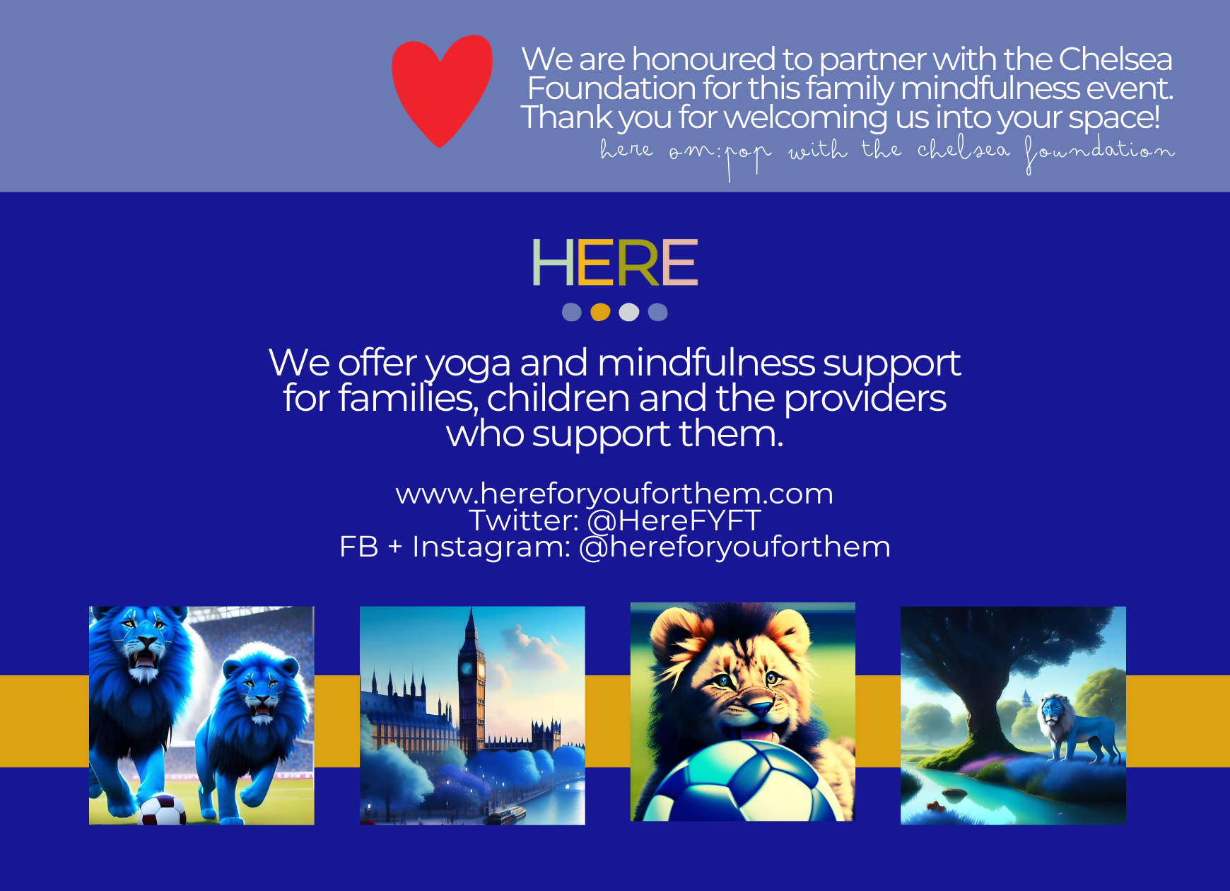 It is an honour to partner with the Chelsea Foundation little lions and lionesses to bring our Om:Pop mindfulness sessions to the families they support through their “Active Families” workshops. “The Chelsea FC Foundation is the world’s leading football social responsibility programme, using the power of football to motivate, educate and inspire.” They support communities and individuals in 125 towns and cities around the world, with over 300 staff, developing programmes for more than 800,000 participants.”